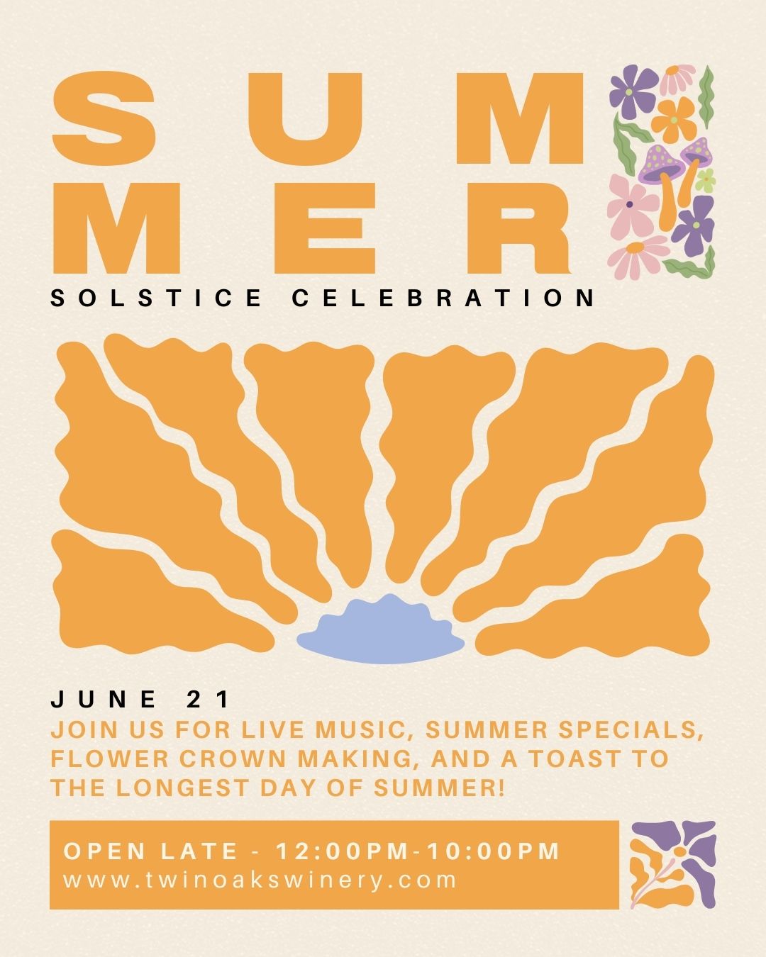 Soak in the magic of the longest day of the year with golden hour vibes, live music, and sunset wine flights. Enjoy farm-to-table grazing boards, DIY flower crowns, and a wishing tree. Dress in your flowiest summer fits and celebrate the season with us!